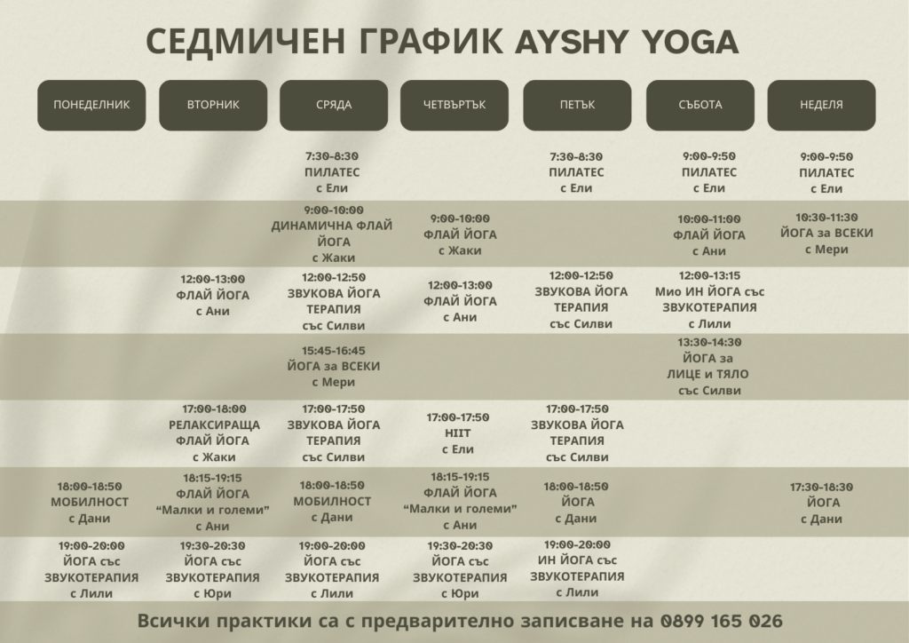 - Динамична Fly йога с Жаки – сряда от 9:00-10:00 ч. Зала AYSHY YOGA, бул. Цар Освободител 263а, за записване 0884 521558